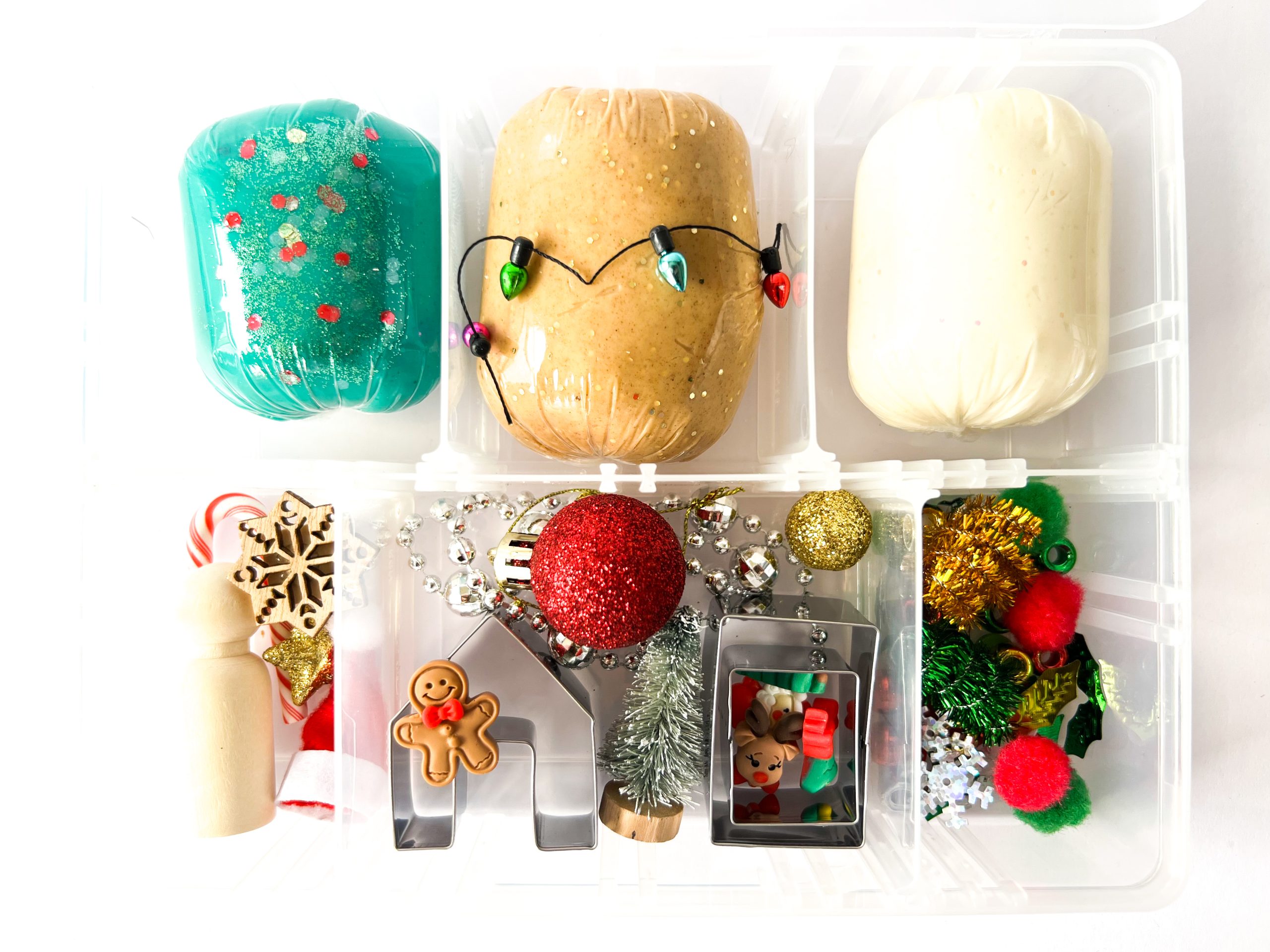 A mini ‘Elf’ size kit containing mini ‘Elf’ size loose parts and mini ‘Elf’ size rolls of our super soft, signature dough with a sprinkle of biodegradable glitter – 150g in total.
